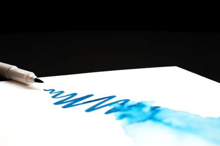 watercolor brush marker smears blue paint, spread ink on paper, close up. Artist supplies concept