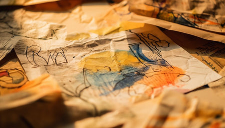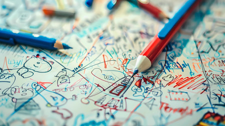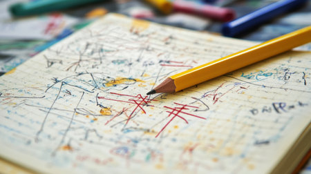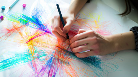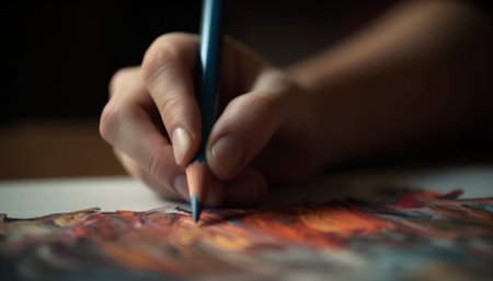 Creative artist hand holds pencil, coloring childhood imagination on paper generated by artificial intelligence