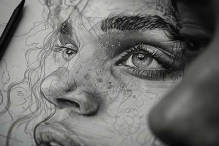 Artist hand actively drawing a human face portrait using charcoal on a white sheet of paper. highlights creativity, skill, and the artistic process.