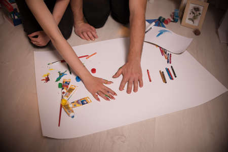 Two lovers draw with paints. Hands are covered with paint. love.