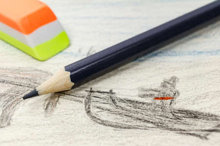 Black pencil and eraser on the background of children's drawing