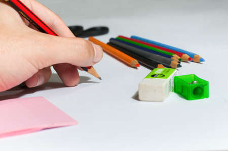 Man's hand drawing with a colored pencil on a notebook