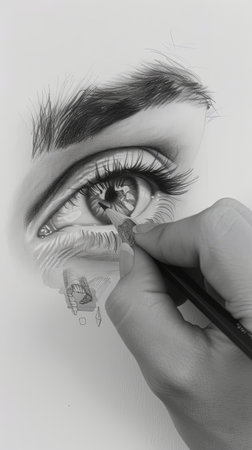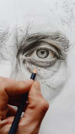 This captivating image features a close-up of a hand drawing an eye with pencil on paper, showcasing remarkable detail and artistry involved in realistic portrait creation.
