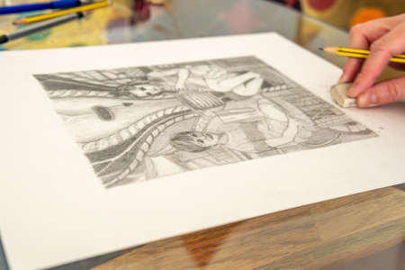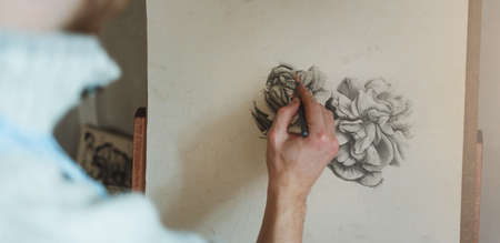 painter paints a pencil sketch on paper