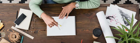 partial view of african american architect working with divider and sketchbook at home, banner