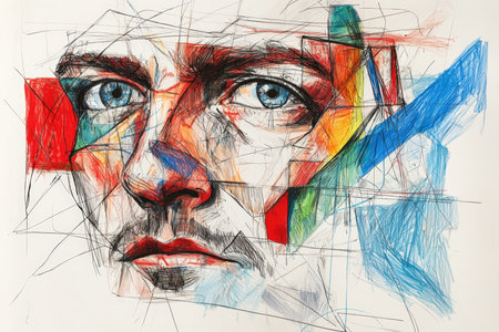 A mesmerizing portrait showcases a man's face with striking blue eyes, surrounded by vibrant geometric colors and dynamic lines. Artistic expression captures depth and emotion.