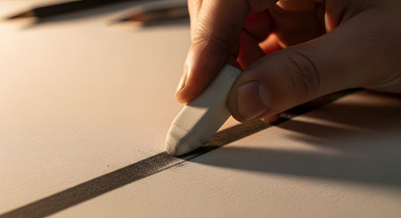 A close-up shot of an artist's hand holding a white eraser and carefully removing a portion of a thick, dark charcoal or pencil line on textured paper. The image represents the artistic process, making corrections, imperfection, and the act of creation.