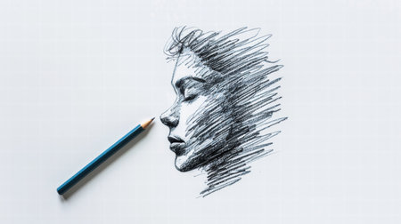 An intricate line drawing depicts a peaceful face with delicate features, emphasizing the beauty of simplicity and artistic expression on textured paper.
