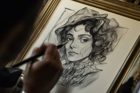 Artist meticulously adding intricate details to a hand drawn portrait of a stylish woman adorned with an elegant hat