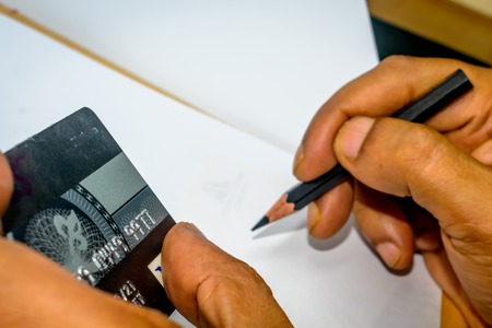 Hands holding credit card and making calculation of expenses. Online shopping using debit or credit card and calculating on the blank page at home. Cropped shot of a man's hands writing on a notebook.
