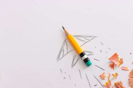 Close up view of pencil and drawing portrait on white sheet