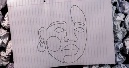 Sketch of woman face on white lined paper against crumbled papers in background. school and education concept