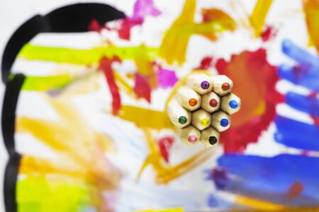 Colorful pencils in fantasy style on light background. Summer textile collection. Colorful graphic. Artistic wallpaper. Kid graphic.