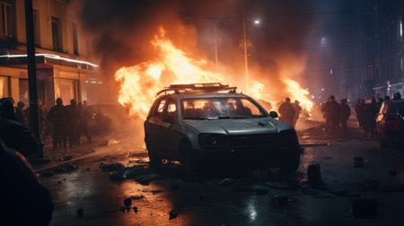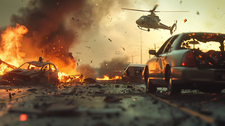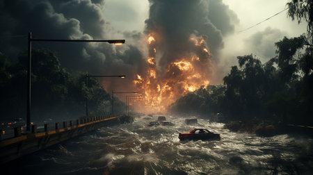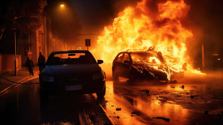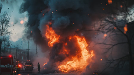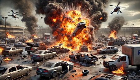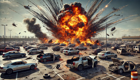 Generative AI, fiery explosion, and heavy black smoke in a parking lot