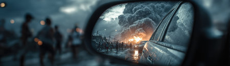 Dramatic reflection in car mirror shows fiery explosion and dark smoke, with blurred figures in the background, creating an atmosphere of chaos and urgency