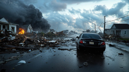 The landscape is filled with destruction as homes lay in ruins, cars are overturned, and debris covers the ground in the wake of a powerful hurricane.