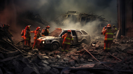 Emergency responders working amidst wreckage. Rescue team providing assistance and support after collapse. Generative AI