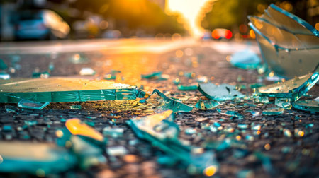 Car Crash Aftermath: Shattered Glass and Debris on Street, Blurred Vehicles in Background, Highlighting the Danger and Reality of Road Accidents. AI generated
