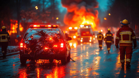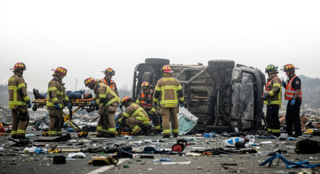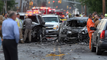 A traffic accident scene with emergency responders and vehicles, highlighting the importance of road safety and quick response.