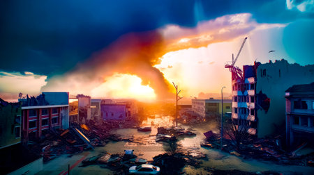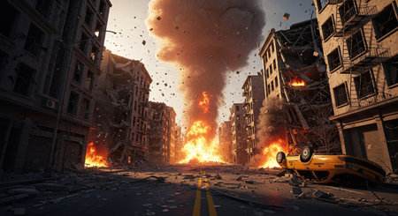 An obliterated cityscape depicts the aftermath of a massive blast, featuring widespread destruction, intense infernos, and a flipped vehicle amidst the rubble.
