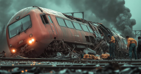 Emergency teams examine a derailed train, assessing damages and collecting evidence following the railway accident.