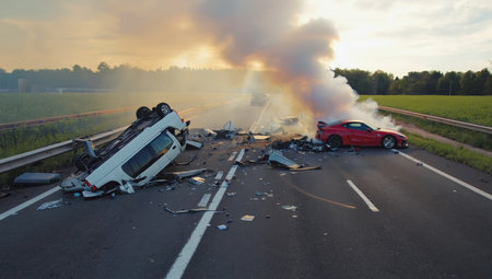 Severe highway accident with an overturned white vehicle and a wrecked red sports car, debris scattered across the road, and thick smoke rising in the background, creating dangerous crash accident.