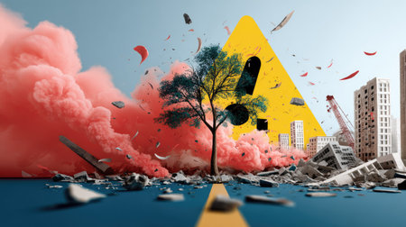 This striking image showcases a surreal landscape filled with colorful chaos, featuring a tree standing resilient amidst smoke and urban destruction.