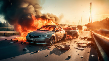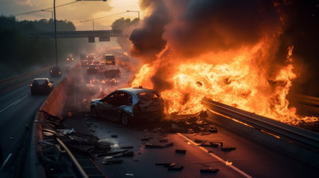accidents with fire and a lot of smoke on the road, traffic jam on the highway. smoke from an explosion in the distance in the background, by ai generative