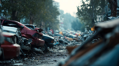 Cars are stacked high on the street, completely destroyed, after a disaster. The background shows a blurry city scape and trees. This image invokes themes of devastation.