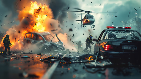 The rescue team is working at the site of the man-made disaster. Destruction after a terrorist attack. Generative AI