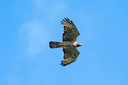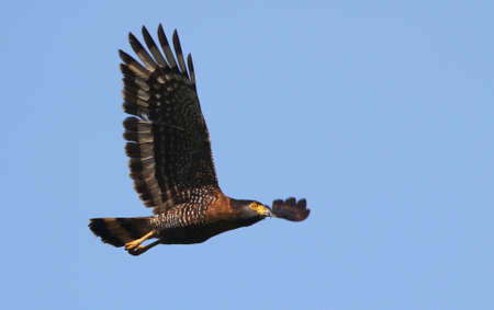 A Grey-lined hawk soaring in the blue sky. Bird in flight. Wildlife in nature. Raptor hunting for food.