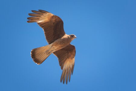 Brahminy kite eagle soaring high in the clear white sky.