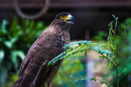 Crested serpent eagle in captivity at zoo. Spilornis cheela is a bird of prey that is found in forested habitats across tropical Asia