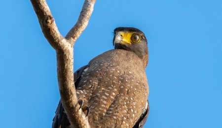 Crested serpent eagle perch close-up profile shot, Transparent third eyelid wipes close the eye of the eagle, protecting the eyes from the dust and the wind while keeping the eye moist and clean.