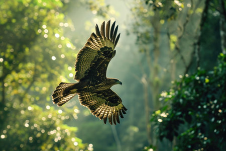 Majestic Bird of Prey in Flight against Misty Forest Background, Wild Raptor Soaring with Outstretched Wings in Natural Habitat AI Generative