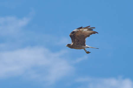 Chimango caracara (Phalcoboenus chimango), a medium sized raptor native to the Southern Cone, flying on a sunny day.