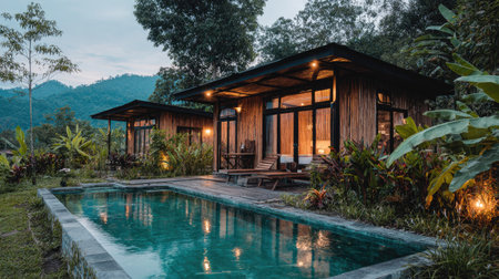 Two modern wooden cabins feature large windows and a rectangular pool reflecting the surrounding environment. The composition highlights the structures within a green landscape. The image evokes a sense of tranquility and could be suitable for architectural, travel, or lifestyle content.