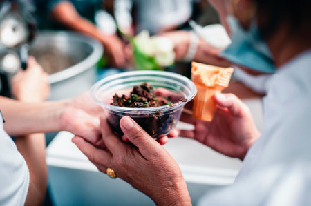 The Hope of the Poor by Donating Charity Food to the Immaculate : Participation in sharing food for the poor : The Concept of Love : The beggar is waiting for food from charity aid