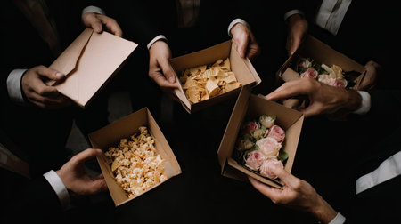 This captivating image shows groups of hands holding various boxes containing snacks and flowers, perfect for events or celebrations.