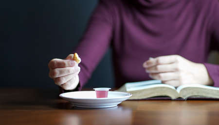 Woman holding a piece of biscuit with cup of wine on table. Taking Christian Holy Communion concept.