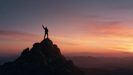 Person in silhouette stands victorious on mountain summit during colorful sunset