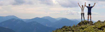 Panorama of young couple, athletic boy and slim girl standing with raised arms on rocky mountain top enjoying breathtaking summer mountain view. Tourism, traveling and healthy lifestyle concept.