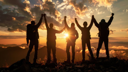 Group of hikers celebrating at sunset, raising hands in triumph against stunning mountain backdrop. scene captures sense of adventure, camaraderie, and achievement