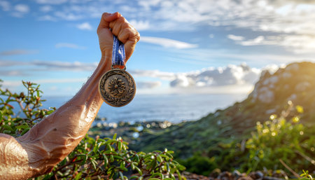 Athlete holding up a medal in victory against a scenic backdrop