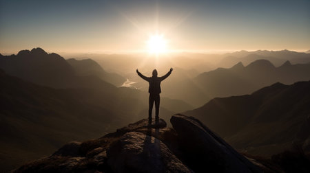 A figure stands on a mountain peak with arms open, celebrating a breakthrough moment as sunlight floods the landscape during sunset.