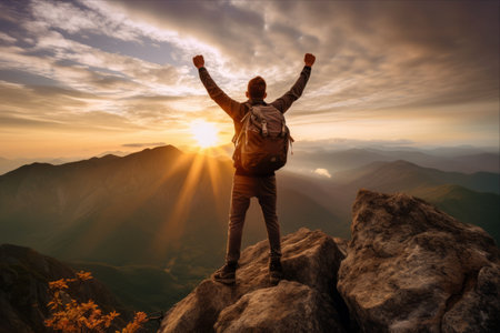Successful young man standing on top of a mountain and raising his hands up in the air with a beautiful sunrise in the background