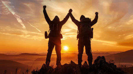 Silhouettes of two hikers celebrating at sunset, raising their arms in triumph against vibrant sky filled with clouds. scene captures sense of achievement and adventure