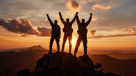 Peak triumph: silhouettes a top mountain, joyous group celebrates team success, embodying shared victories, harmonious collaboration, euphoria of collective achievement in nature's majestic embrace