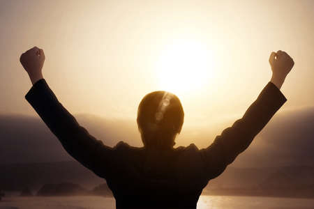 A person stands with arms raised in triumph against a glowing sunset embracing the moment of victory.