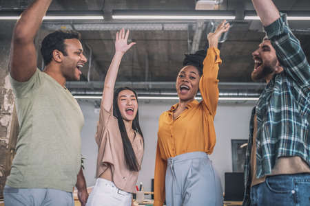 business people raising hands celebrating success in office, rejoicing at victory, booming business, compant has earned much money, happiness, well doen, good job, emotion, feeling, reaction